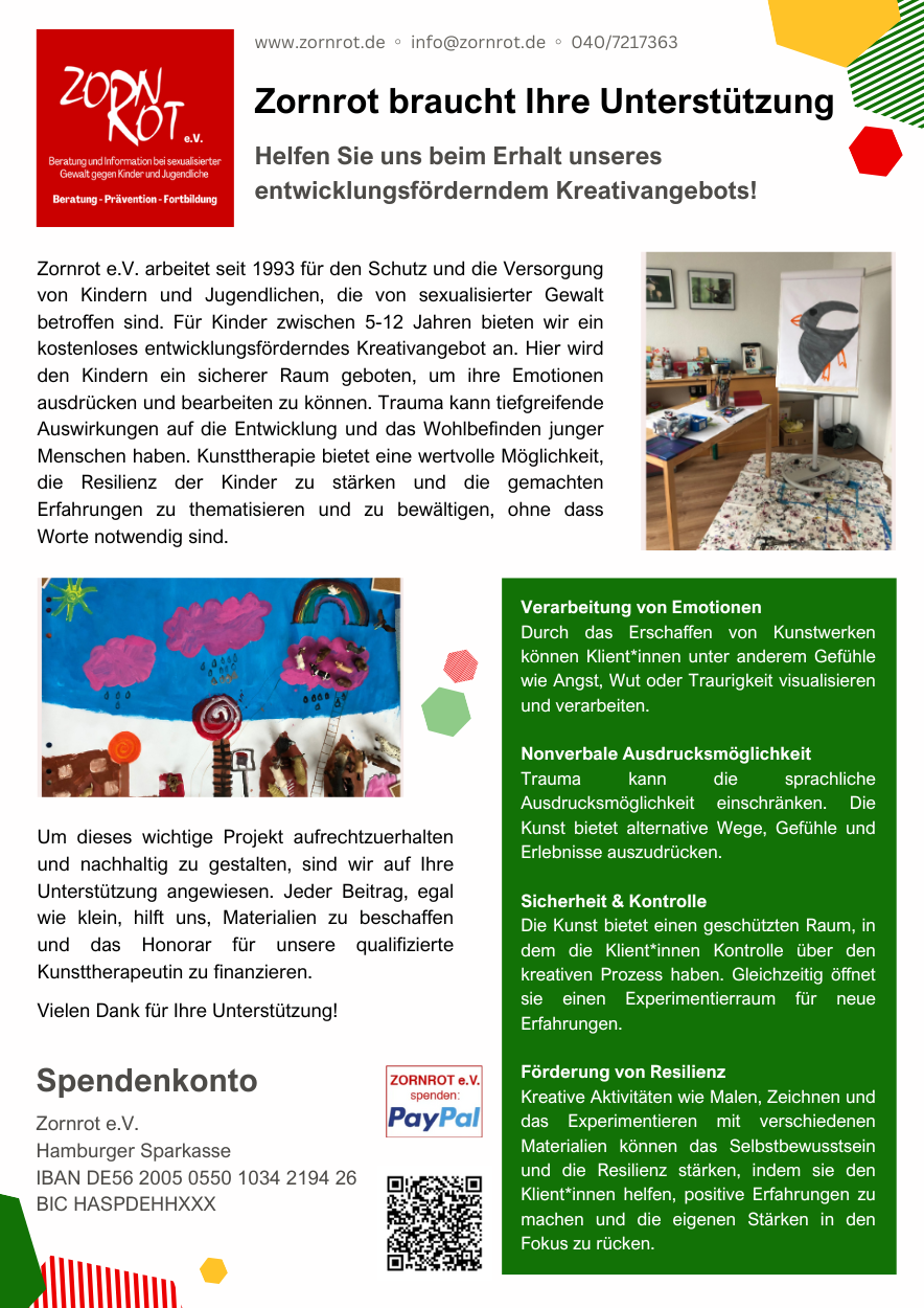 Dazu gehören auch die Material-, Honorar- und Supervisionskosten für unser entwicklungsförderndes Kreativangebot. Hier sind wir auf Ihre Unterstützung angewiesen. Jede Spende leistet einen wichtigen Beitrag zum Erhalt unseres Angebots und damit zur Versorgung betroffener Kinder, Jugendliche und Jungerwachsener.
